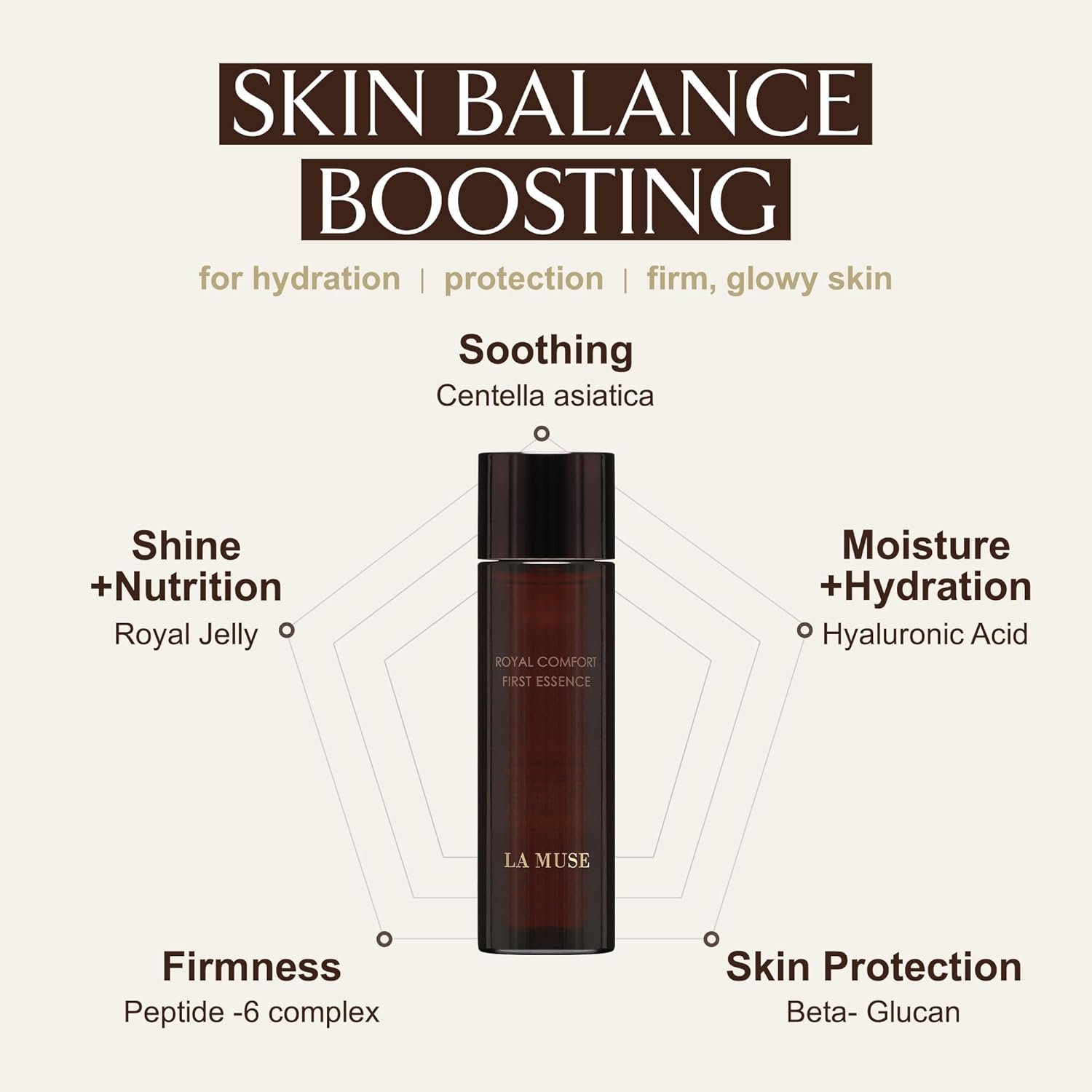 LA MUSE Royal Comfort First Essence (150ml); is a mildly acidic essence with fast-absorbing oil capsules for moisturized and nourished skin.