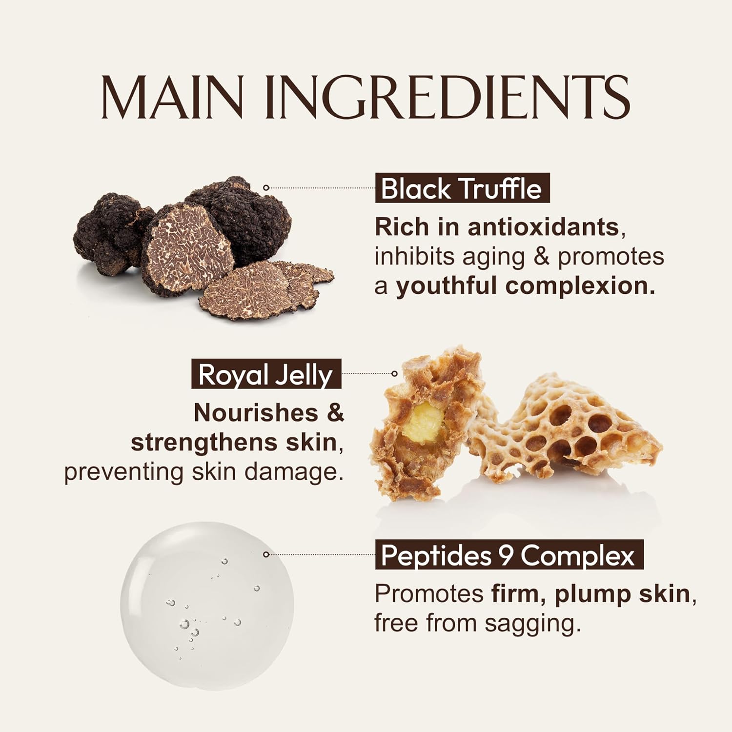Tuber Melanosporum Extract, Glycerin, Methylpropanediol, Polyglycerin-3, Niacinamide, 1,2-Hexanediol, Centella Asiatica Extract, Portulaca Oleracea Extract, Laminaria Japonica Extract, Eclipta Prostrata Leaf Extract, Rosmarinus Officinalis (Rosemary) Leaf Extract, Chamomilla Recutita (Matricaria) Flower Extract, Royal Jelly Extract, Hydrogenated Lecithin, Caprylic/Capric Triglyceride, Octyldodeceth-16, Water, Acrylates/C10-30 Alkyl Acrylate Crosspolymer, Tromethamine, Butylene Glycol, Xanthan Gum, Adenosine, Disodium EDTA, Hydrolyzed Hyaluronic Acid, Acacia Senegal Gum, Fructooligosaccharides, Gelatin, Beta-Glucan, Sorbitan Laurate, Hesperidin Methyl Chalcone, Steareth-20, Hydroxyethylcellulose, Acetyl Dipeptide-1 Cetyl Ester, Palmitoyl Tripeptide-5, Dipeptide-2, Sodium Lactate, Carbomer, Palmitoyl Pentapeptide-4, Nonapeptide-1, Acetyl Hexapeptide-8, Copper Tripeptide-1, Tripeptide-1, Palmitoyl Tetrapeptide-7, Palmitoyl Tripeptide-1, Hexapeptide-9, Polysorbate 20, Hydroxyacetophenone, Ethylhexylglycerin, Caprylyl Glycol, Fragrance, Linalool, Benzyl Salicylate.