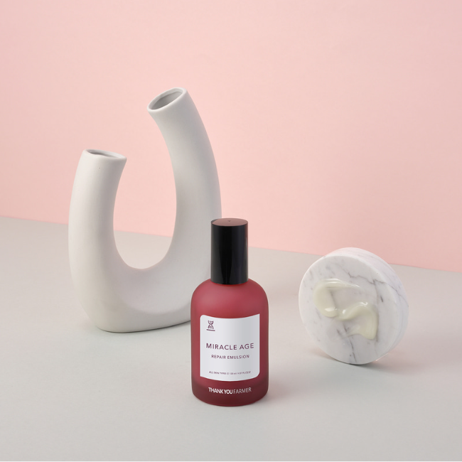 One of our best-selling Thank You Farmer Miracle Age Repair Emulsion, which is formulated to work as an energizer to restore vitality to lacklustre skin. This high-density emulsion contains Burdock Extract to help brighten and revive the skin's natural glow. Peony Extract provides protection against anti-ageing free radicals while skin-plumping ingredients restore firmness and smoothness to the skin.