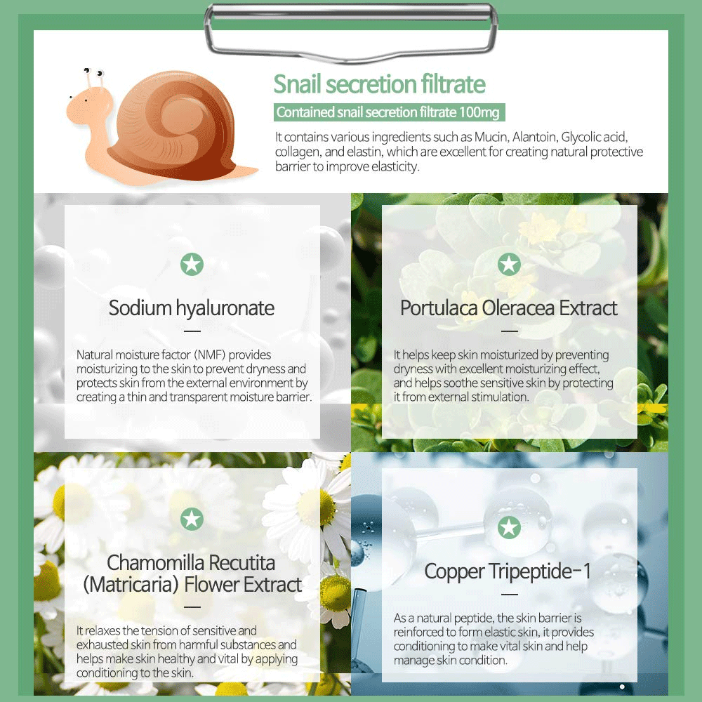 - Water, PEG-240/HDI Copolymer Bis-Decyltetradeceth-20 Ether, Glycerin, Niacinamide, Dimethicone, Sorbitan Stearate, Snail Secretion Filtrate, Helianthus Annuus (Sunflower) Seed Oil, Tocopherol, Sodium Hyaluronate, Adenosine, Aloe Barbadensis Leaf Extract, Portulaca Oleracea Extract, Chamomilla Recutita (Matricaria) Flower Extract, Copper Tripeptide-1, Tocopheryl Acetate, Retinyl Palmitate, Trehalose, Butylene Glycol, Ethylhexylglycerin, 1,2-Hexanediol, Caprylic/Capric Triglyceride, Disodium EDTA, Phenoxyethanol, Methylparaben, Propylparaben, CI 19140, CI 42090, Fragrance