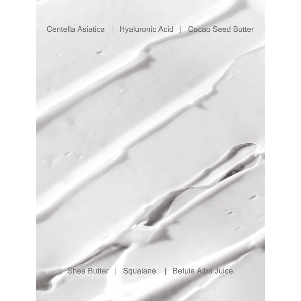 - Water, Glycerin, Theobroma Cacao (Cocoa) Seed Butter, Caprylic/Capric Triglyceride, Butyrospermum Parkii (Shea) Butter Betula Alba Juice, 1,2-Hexanediol, Squalane, Hydrogenated Olive Oil Lauryl Esters, Cetearyl Alcohol Polyglyceryl-3 Methylglucose Distearate, Macadamia Ternifolia Seed Oil, Glyceryl Stearate Butylene Glycol,,Hydrogenated Vegetable Oil Cetearyl Olivate, Centella Asiatica Root Extract, Centella Asiatica Leaf Extract, Centella Asiatica Extract, Sorbitan Olivate, Carbomer, Tromethamine Tocopheryl Acetate, Ethylhexylglycerin, Lecithin, Sodium Hyaluronate, Biosaccharide Gum-1, Potassium Hyaluronate, Hydroxypropyltrimonium Hyaluronate Hydrolyzed Sodium Hyaluronate, Hydrolyzed Hyaluronic Acid Hyaluronic Acid, Pentylene Glycol, Madecassoside, Madecassic Acid, Asiaticoside, Asiatic Acid Sodium Hyaluronate Crosspolymer Sodium Acetylated Hyaluronate