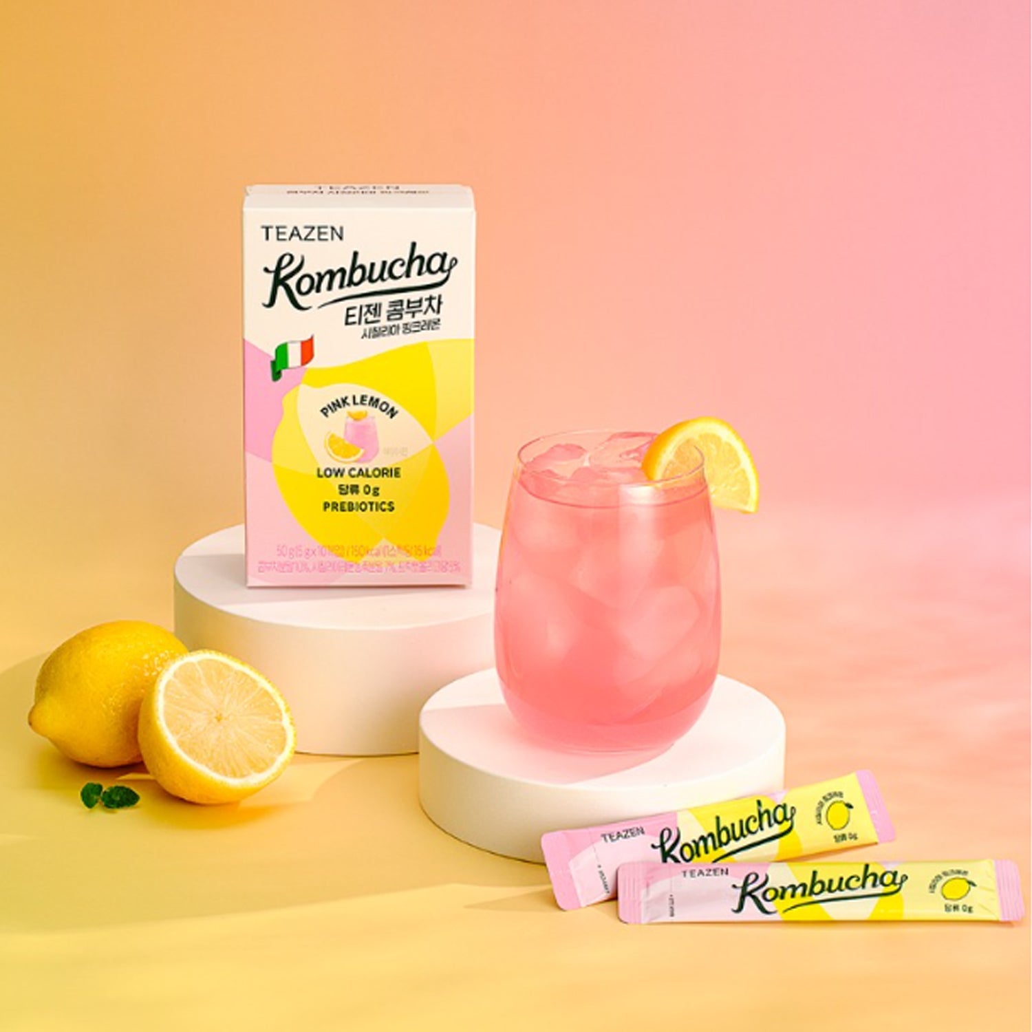 Citric acid, sodium bicarbonate, kombucha powder 10% (domestic/Tizen Signature Kombucha fermentation liquid 75%, dextrin), Fiberist, Sicilian lemon concentrate powder | 7% [Dextrin, Sicilian lemon concentrate 29.95% (Si | Chilean lemon 100%, made in Italy), Arabic gum], | Erythritol, Fructooligosaccharide 5%, Flavoring 1, Red | | Beet concentrate powder (made in Germany), Vitamin C, Flavoring agent (starch syrup, | Arabic gum, D-sorbitol solution, processed oil, sucrose fatty acid | ester, flavoring), Sucralose (sweetener), Naringin, 12 types of lactic acid bacteria mixed powder, Tricalcium phosphate Contains milk and soybeansSpecs